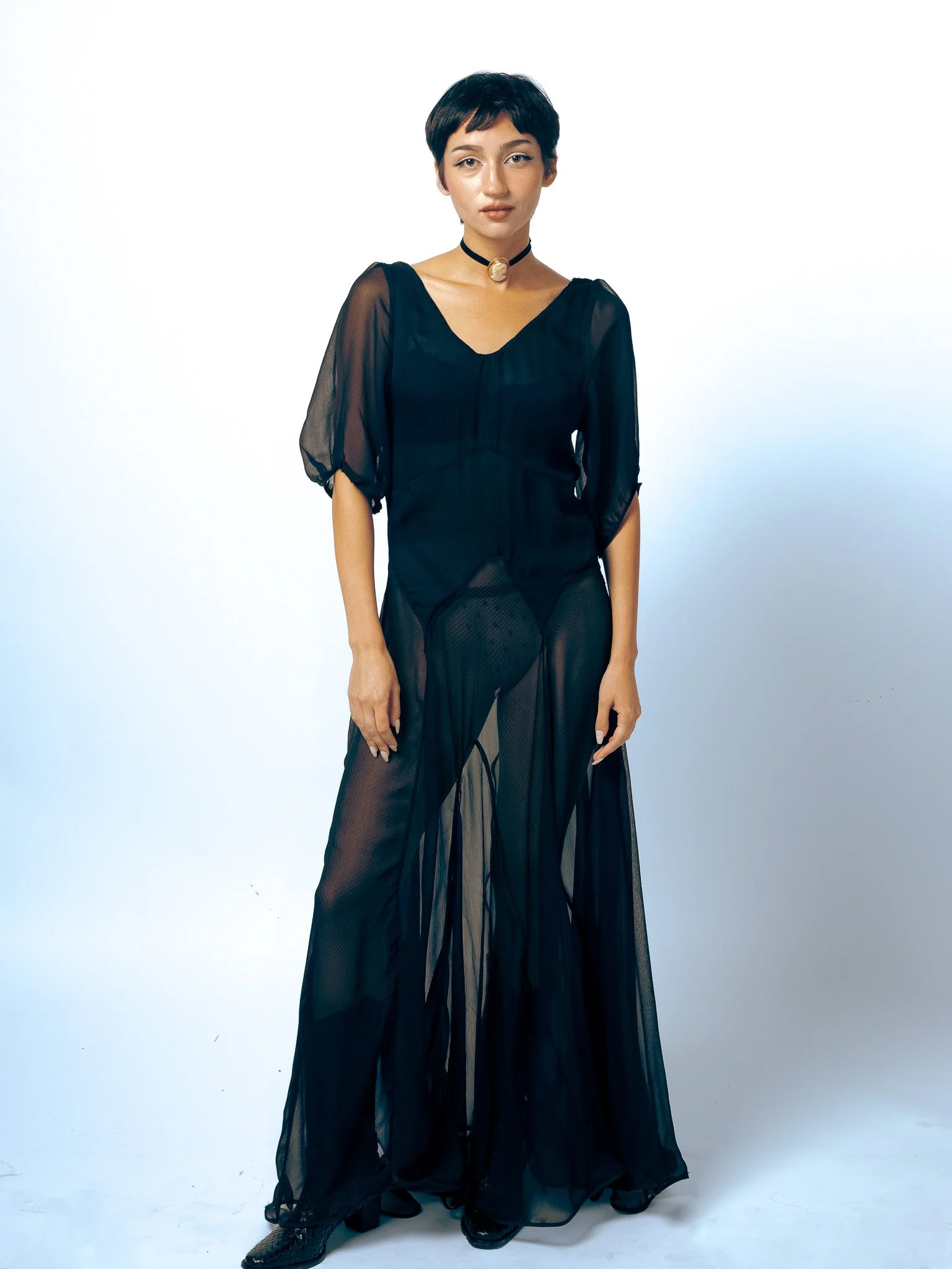 This dress was made in collaboration with Chelsea Von Mach for her Fall 2023 collection “Coquette Vampire.” It is inspired by 1930’s silhouettes and is a one of a kind piece made with very delicate silk chiffon and finished with bias binding. The garment is made very thoughtfully and it is a complex design with vintage influence, shown through a modern perspective. The chiffon is dead stock and sourced in Los Angeles. It is totally couture and was sold in Chelsea’s store in Santa Monica.